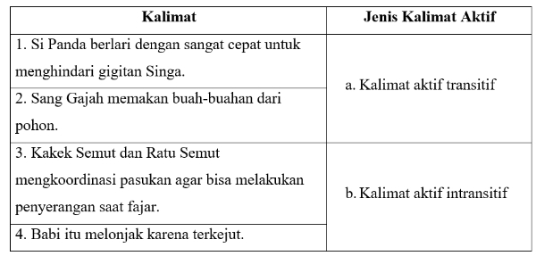 Kalimat aktif sendiri terbagi atas beberapa macam, yakni kalimat aktif transitif, kalimat aktif intransitif, kalimat aktif ekatransitif dan kalimat aktif dwitransitif.